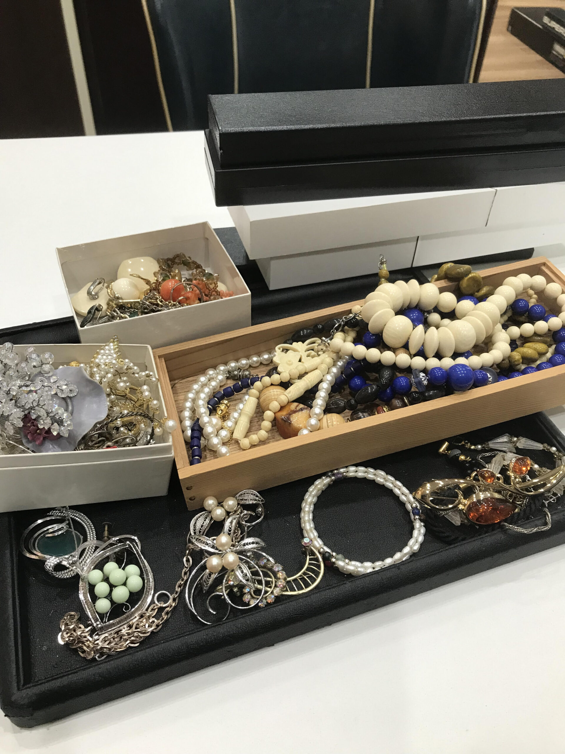 先日ご来店いただいたお客様が遺品整理の際に見つかったお品物をお持ちくださいました。ご実家に飾ってあった花瓶などの骨董品のほか、ネックレスやブローチ、イヤリングなどのアクセサリーもたくさんありました。しかしお客様は「これは本物ではないので、買い取ってもらえないのでは...」と少し不安そうなご様子でした。