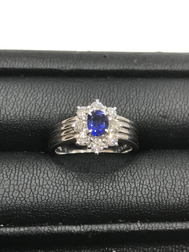 先日、お客様よりとても綺麗なサファイアが付いているプラチナリングをお買取させていただきました。サファイアとその周りのメレダイヤが特徴で高級感があるお品物でした。