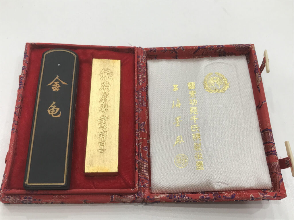 今回お持ち込みいただいたお品は、中国で購入されたという固形墨で、豪華な布張りの箱に収められた美しい墨のセットでした。墨の表面には金色の装飾や文字が施されており、見た目も楽しめる墨です。