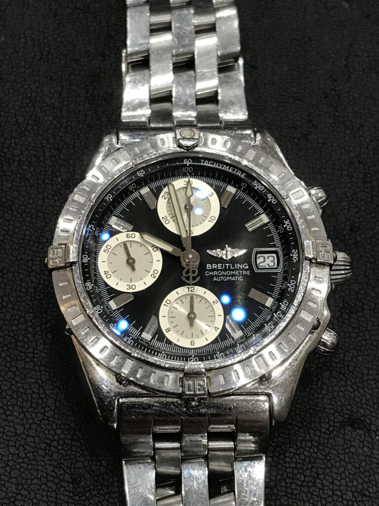 こちらのブライトリングの腕時計は、20年以上前にご購入されたというクロノグラフモデルの腕時計でしたが、今回は「付属品がない状態」でのお持ち込みでした。